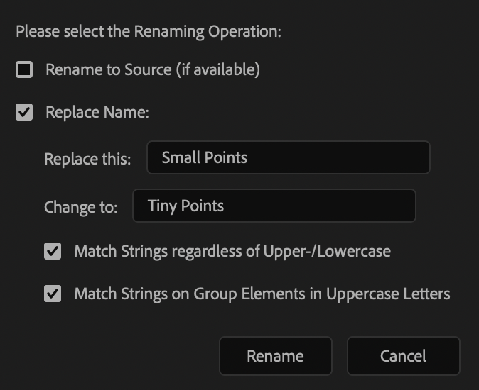 If you want to change one name throughout the entire comp, use this function. It will change the name even if it is just one part of the name. If you are in *Split Mode*, it will only consider the split name level. To execute it, press *Shift+Return (Win)* or *Shift+Return (Mac)*.
